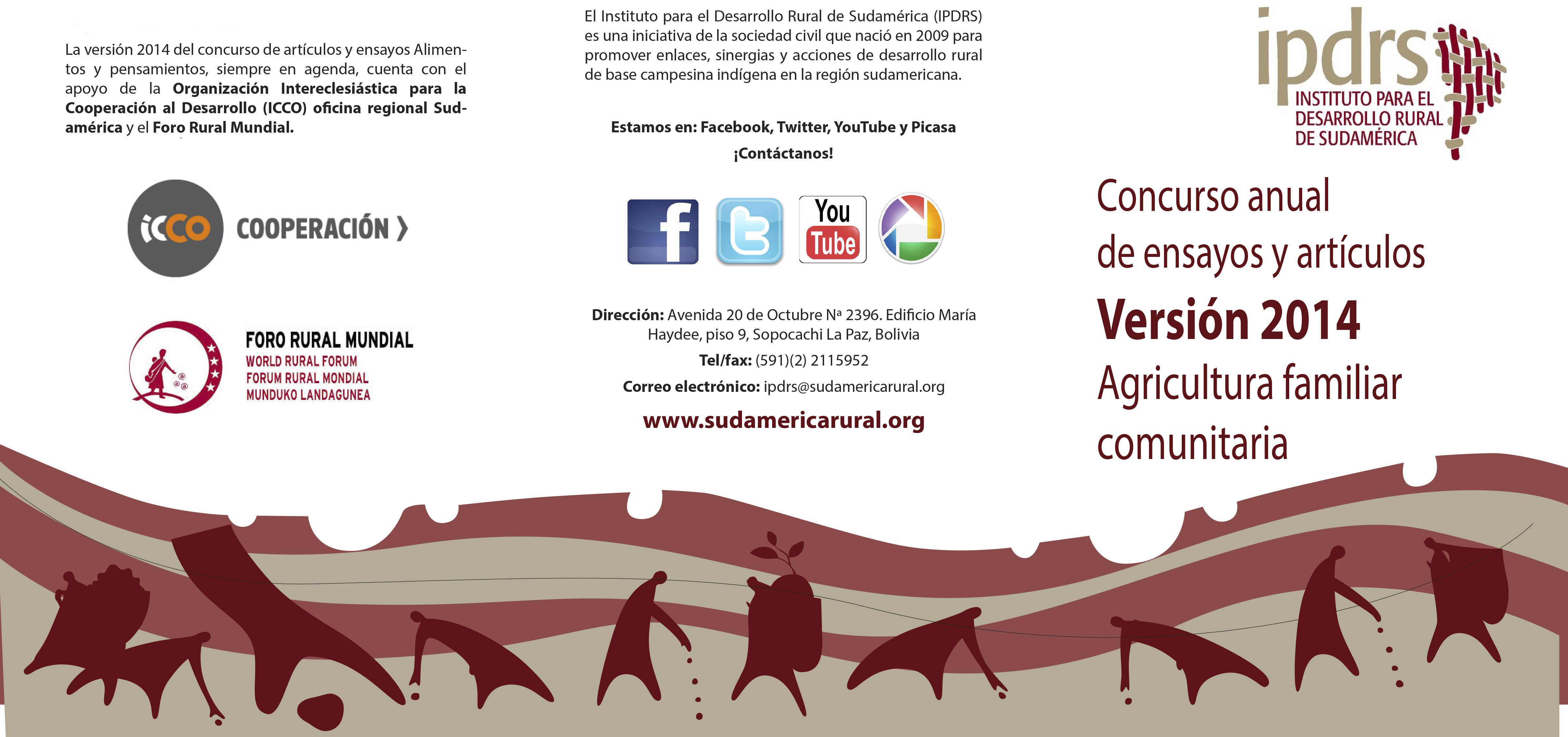 Con el objetivo de difundir toda la información referente al concurso anual de artículos y ensayos Alimentos y pensamientos siempre en agenda en su versión 2014, el Instituto para el Desarrollo Rural de Sudamérica (IPDRS) elaboró un nuevo tríptico informativo, material disponible tanto en impreso como en formato digital en la sección Nuestra producción, Impresos.