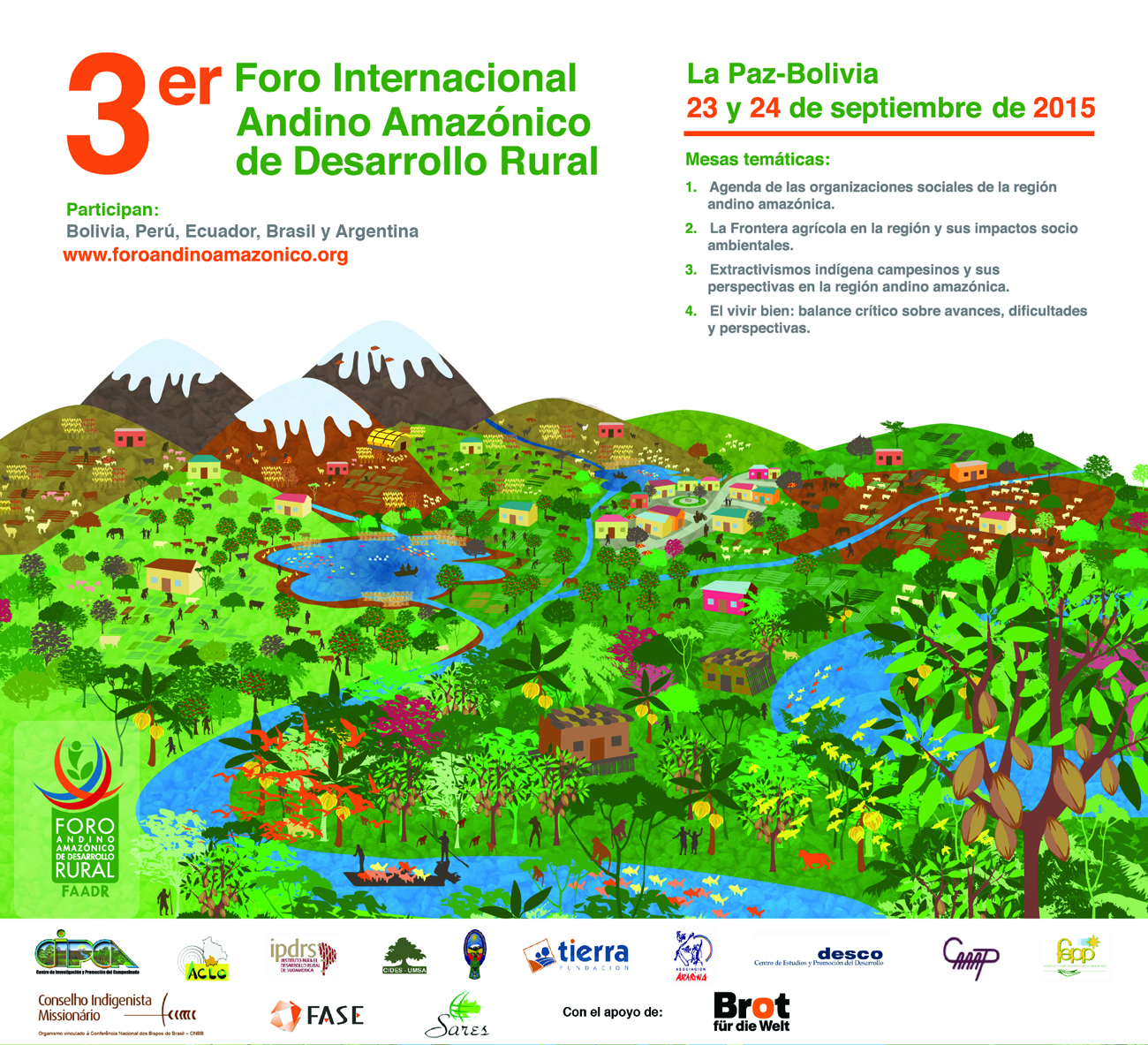 La Agenda de las organizaciones sociales de la región andino amazónica; La frontera agrícola en la región y sus impactos socio ambientales; Extractivismos indígena campesinos y sus perspectivas en la región andino amazónica; y El vivir bien: balance crítico sobre avances dificultades y perspectivas, son las cuatro temáticas que se abordarán en el Tercer Foro Andino Amazónico de Desarrollo Rural FAA-DR, espacio de debate público, plural y democrático sobre desarrollo rural en la región andino-amazónica que se realizara el 23 y el 24 de septiembre de 2015 en La Paz Bolivia y que congregará a participantes y expositores de Argentina, Bolivia, Brasil, Ecuador y Perú.