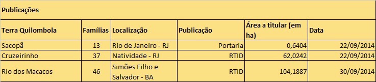 Em setembro, o Incra publicou aPortaria de Reconhecimento da comunidade Sacopã, situada na zona urbana do município do Rio de Janeiro. O órgão federal será responsável por titular apenas uma pequena porção do território, já que o Incra, a comunidade e a Prefeitura Municipal acordaram na Câmara de Conciliação da Advocacia Geral da União que a área sobreposta ao Parque Municipal Guilherme Melquior será desafetada e o município será o responsável pela regularização dessa área.