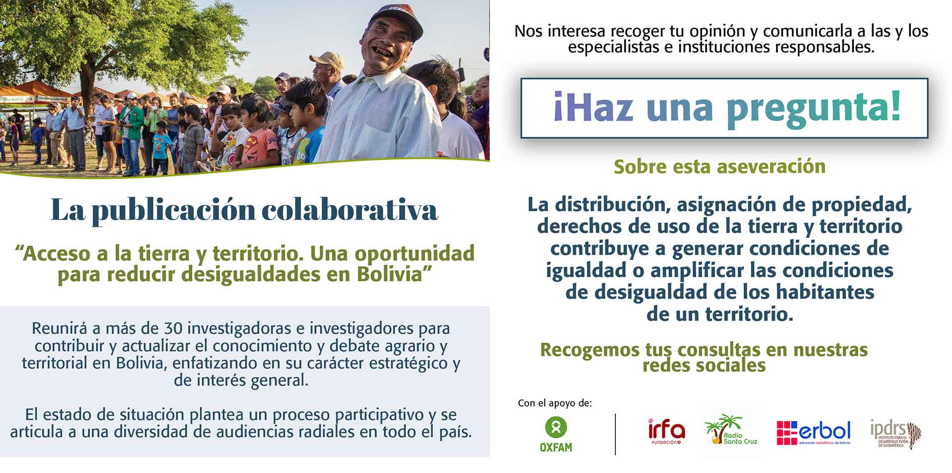 Con el objetivo de adelantar información y argumentos para un debate razonado sobre el acceso a la tierra y territorio en Bolivia, entre el IPDRS y Oxfam, de cara a la coyuntura político-electoral de 2025, nos proponemos organizar un proceso de investigación y difusión para abordar diferentes temáticas. Trabajamos desde una perspectiva informativa, razonamiento estructural y una orientación hacia nuevos desafíos articulando el tema de tierra y territorio con las cuestiones ambientales, socioculturales, políticas y respecto al desarrollo sostenible.